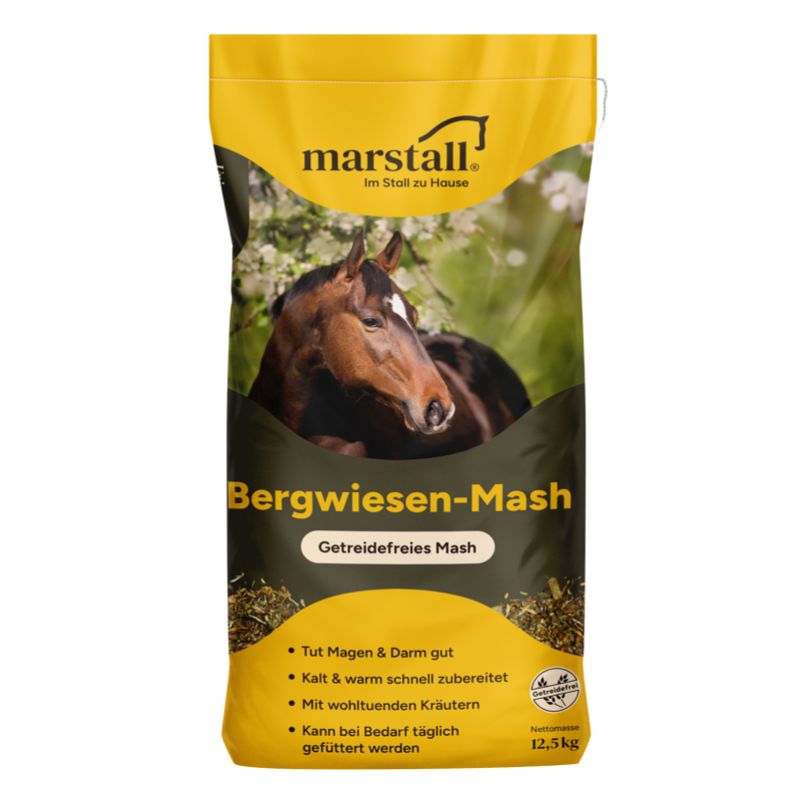 Το Bergwiesen-Mash είναι μίγμα για πολτό χωρίς δημητριακά με χαμηλή περιεκτικότητα σακχάρων. Είναι εξαιρετικά εύπεπτο, δεν επιβαρύνει το έντερο, προάγει την πέψη και τονώνει την όρεξη. Δεν περιέχει δημητριακά, μελάσα ή τεχνητά σάκχαρα, πίτυρα ή αρώματα. Χωρίς πρόσθετες βιταμίνες και ανόργανα στοιχεία. Είναι τροφή πλούσια σε χόρτο από το Allgäu, ευεργετικά βότανα και συστατικά που βοηθούν στην πέψη όπως λιναρόσπορο, στέμφυλα ζυθοποιίας και μαγιά μπύρας διατηρώντας το στομάχι και τον εντερικό σωλήνα υγιή. Προετοιμάζεται εύκολα με την προσθήκη νερού. Εύγευστο ζεστό ή κρύο.